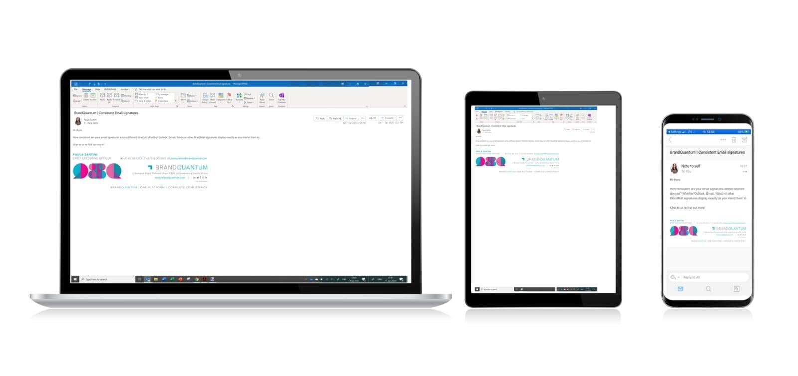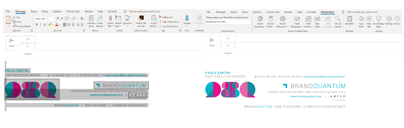 Develop email signatures in line with your brand specifications which look consistent, no matter which device or platform they are viewed on. Your signatures are tamper-proof and centrally managed. More importantly, users see their signatures, banners and surveys when they create, reply or forward emails. BrandMail does not reroute your emails via any external servers and does not append rules to your exchange environment. It works directly within Microsoft Outlook.